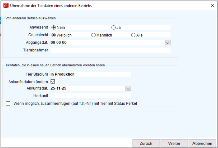 Wechseln Sie in PigExpert zu dem Betrieb, in den die Tiere gebracht werden sollen, und öffnen Sie die Daten der einzelnen Tiere. Klicken Sie anschließend auf „Tiere übernehmen“. Es erscheint ein Popup-Fenster, in dem die nächsten Schritte durchgeführt werden.