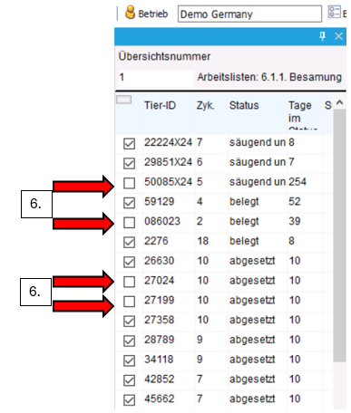 6.    Wenn es Tiere gibt, die noch nicht abgesetzt wurden, können Sie das Häkchen vor der Nummer         entfernen. Dadurch wird verhindert, dass das Tier in der Arbeitsliste erscheint.