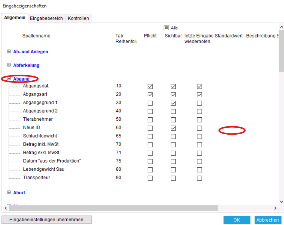 Dies kann als Standardeinstellung unter „Dateneingabe“ → „Eigenschaften“ → „Abgang“ eingerichtet werden. Hier finden Sie das Feld „Neue ID“, in dem Sie die Platzhalter unter „Standardwert“ einrichten können.