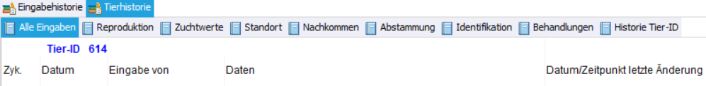 Die Registerkarte Tierhistorie ist weiter in verschiedene Tabs unterteilt. Diese Tabs zeigen nur die Einträge für das ausgewählte oder zuletzt bearbeitete Tier an.