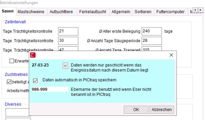 Die Option ist unter "Betriebseinstellungen" zu finden. Es gibt eine Schaltfläche neben der Auswahl PIC in der Dropdown-Liste neben "Arbeitsmethode Zuchtorganisation". Wenn Sie darauf klicken, können Sie das Datum wählen, ab dem PigExpert die Korrekturen in PICtraq vornehmen kann. Drücken Sie zur Bestätigung "OK".
