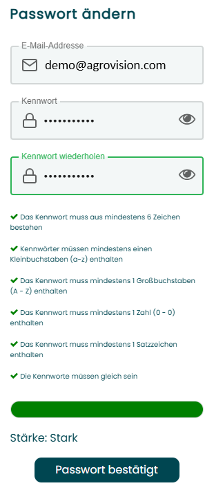 Sie können sich nun mit diesem neuen Passwort bei my.agrovision.com anmelden. Bewahren Sie es daher an einem sicheren Ort auf!
