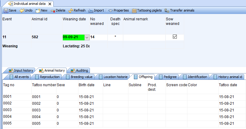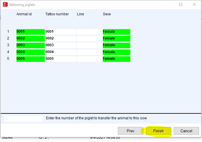 If any error occurs (because for instance an animal ID is already in use) a red cross will appear in front of the Animal ID with the information for why the animal couldn’t be added. If all animals were OK, the screen with tattooing will close and you will have (in this example) 5 tattooed piglets.