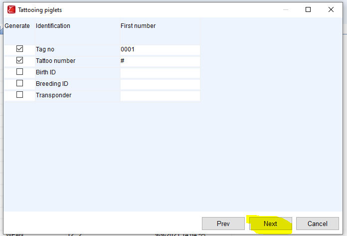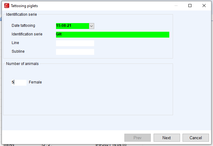 After selecting the tattooing option you can select the Identification serie you need and optional is a Line and Subline for the animals. The Date tattooing is not needed to fill in, PigExpert will automatically fill in the date of birth here. At Number of animals you fill in how many females you want to tattoo, in this example 5. Click on Next
