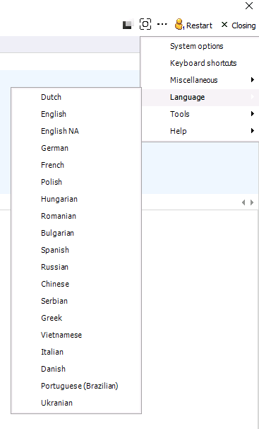 To change the language for the current session, click on the 3 dots in the top right corner and select “Language” and select the preferred language. Based on how many tabs are opened in the program, it may take a while to update these settings.