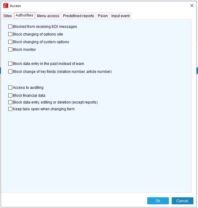 Here, you can block various functions for the user, such as the authority to change data or settings or view financial data.