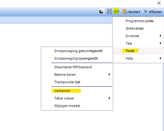 - Navigeer via de drie puntjes naast herstart naar Tools > Verkenner > Export > Bestandsnaam.