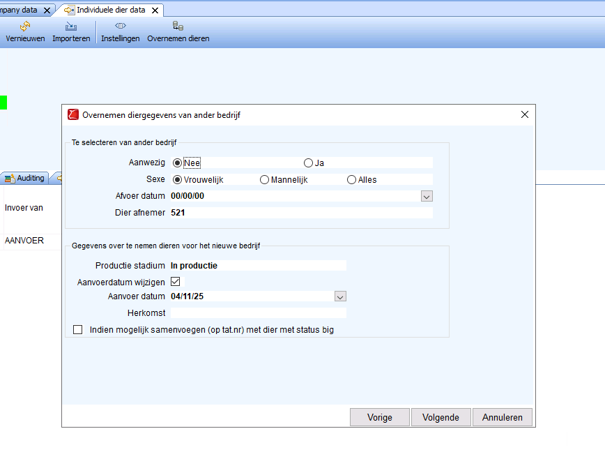 Ga in PigExpert naar het bedrijf waar de dieren naartoe gaan en open Individuele diergegevens. Klik vervolgens op Dieren overnemen. Er verschijnt een pop-upvenster waarin de volgende stappen worden uitgevoerd.