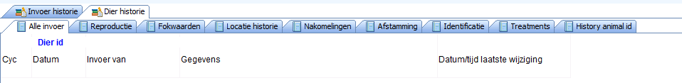 Het tabblad dier historie is weer onderverdeeld in verschillende tabbladen. Op deze tabbladen wordt uitsluitend de invoer van het geselecteerde of laatst verwerkte dier getoond.