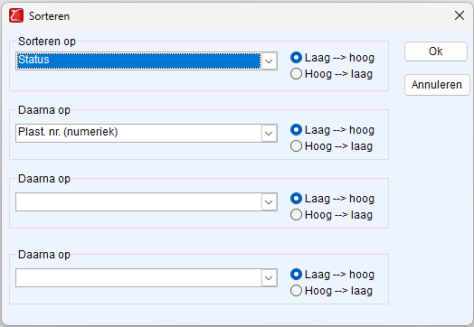 Selecteer de kolommen waarop gesorteerd moet worden. De gegevens zullen als eerste gesorteerd worden volgens de kolom opgegeven bij "Sorteren op". Indien er rijen met dezelfde waarde zijn, zal de sortering gebeuren volgens het 2de criterium "Daarna op" enz.