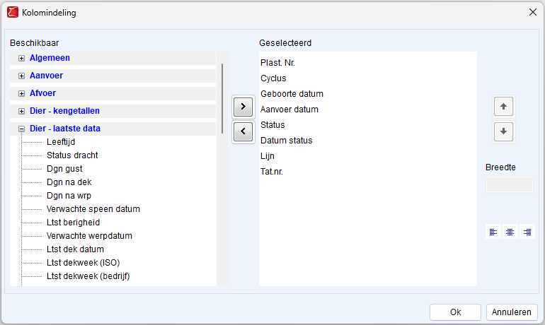 Hiermee worden de gemarkeerde, beschikbare, kolommen verplaatst naar de geselecteerde kolommen. De kolommen worden zichtbaar op het overzicht.