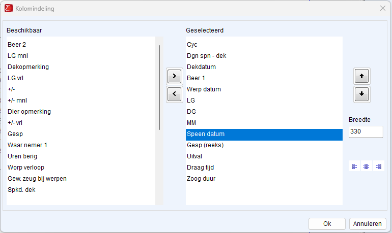 Om de cycli gegevens van de zeugenkaart te wijzigen klik je in de knoppenbalk op: Kolomindeling.