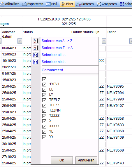 Nadat een overzicht op het scherm is opgevraagd, kan men de gegevens filteren. Door in het menu op de knop "Filter " te klikken wordt er een pijltesknop aan de kop van elke kolom toegevoegd. Door op dit knopje te klikken, krijgt men onderstaand scherm.