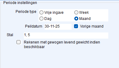 - Als je enkel resultaten van een specifieke stal wilt ophalen kan je de code van de stal invullen bij Stal. Meerdere stallen kan je aangeven door ze te scheiden met een komma.
