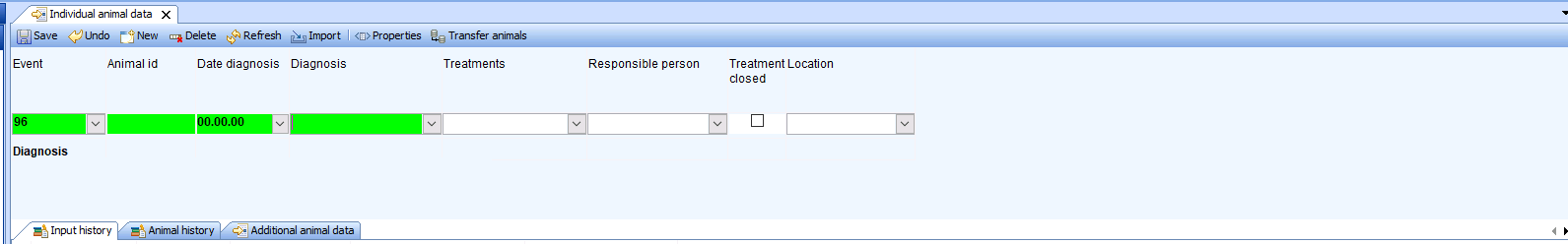 Ga naar Data invoer→ Individuele dierdata en kies het event Diagnose (standaardcode 96). Voer vervolgens de dieridentificatie (plastic nummer, tatoeagenummer) in bij Dier-id, stel de Diagnosedatum in en de bijbehorende Behandeling (Behandelingsplan).