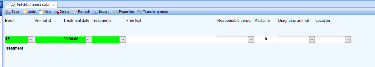 Ga naar Data invoer→ Individuele dierdata en kies het event Behandeling (standaardcode 15).