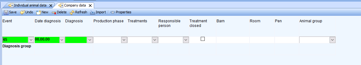 Ga naar Data invoer → Bedrijfsdata en kies het event Diagnose groep (standaardcode: 45). Bepaal vervolgens de Diagnosedatum, de Productiefase en de diagnose. Voer vervolgens de Behandeling in die bij de Diagnose hoort. Als de behandeling is afgesloten, kan dit hier worden geregistreerd door dezelfde Diagnose opnieuw aan te maken en het vakje Behandeling afgesloten aan te vinken. Druk op Opslaan om uw invoer te bevestigen.