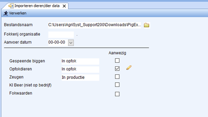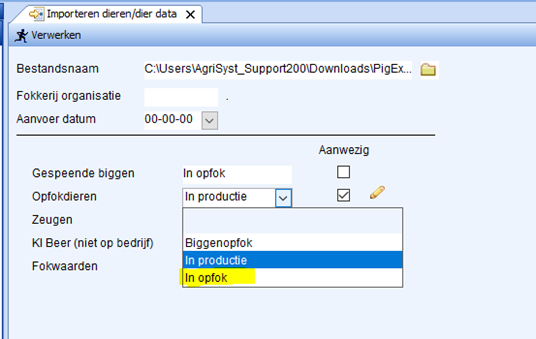 - PigExpert zet vervolgens automatisch een vinkje bij de diercategorie die aanwezig is in het bestand, hier dient men NIETS in te veranderen. In dit geval is dit Opfokdieren. Hierachter staat in welk productiestadium de dieren ingelezen worden: Biggenopfok, In opfok of In productie. In dit geval is dit In productie, maar door hierop te klikken kan men dit wijzigen.