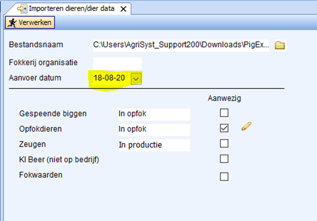 - Vul vervolgens een Aanvoerdatum en eventueel een Fokkerij organisatie in. Klik op verwerken of OK: