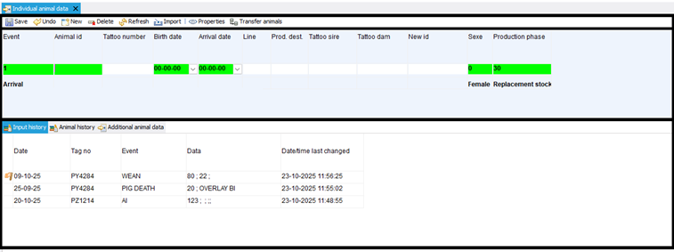 Po otwarciu okna wprowadzania danych w PigExpert, okno jest wypełnione domyślnym układem.