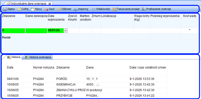 Dolna część ekranu pokazuje historię wprowadzania danych. W zależności od rodzaju wprowadzanych danych dostępne są różne zakładki z informacjami.