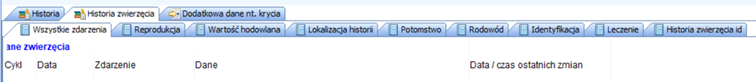 Zakładka Historia zwierzęcia jest podzielona na kilka podzakładek. Wyświetlane są tylko wpisy dotyczące wybranego lub ostatnio przetwarzanego zwierzęcia.