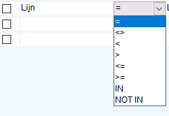Dane (kolumna), które chcemy pobrać, powinny być zawarte w wartości. Podobne do „=”, ale można podać wiele wartości oddzielonych przecinkami. Np. Tag No IN 1,2 pokaże dane dla zwierząt 1 i 2.